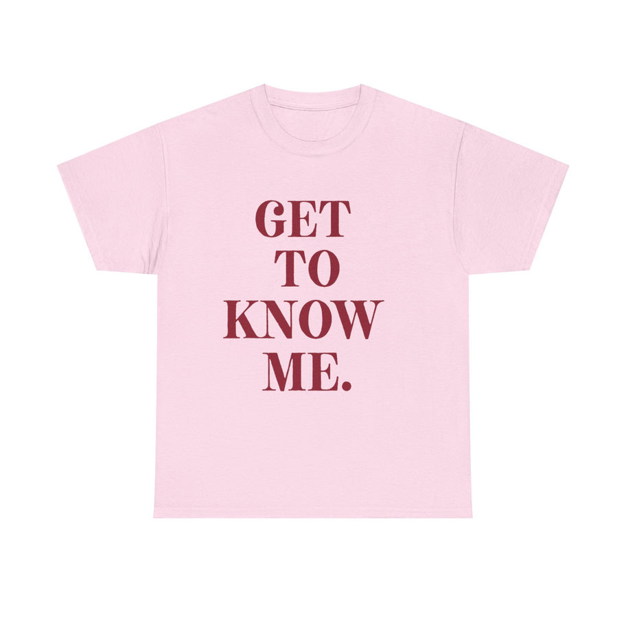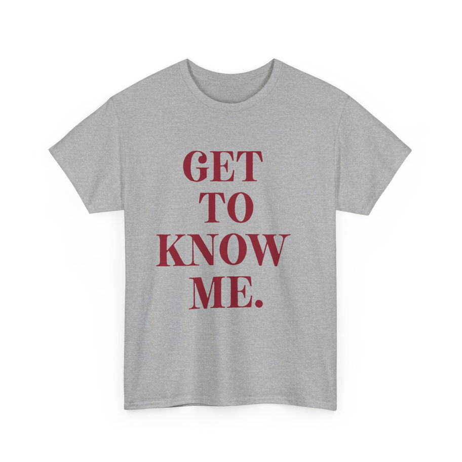 Lightweight, honest, and a little bold — this white tee speaks softly but clearly. The front declares “GET TO KNOW ME.” in tall, serif lettering, with a small illustrated figure tucked near the hem like a private wink. Wear it when you want conversation starters that feel genuine: at coffee shops, open-mic nights, campus strolls, or slow Sunday markets. The classic crew neck and relaxed cut sit comfortably while the clean white canvas keeps the message the center of attention. It’s the kind of shirt that invites curiosity without shouting — approachable, confident, and quietly human.